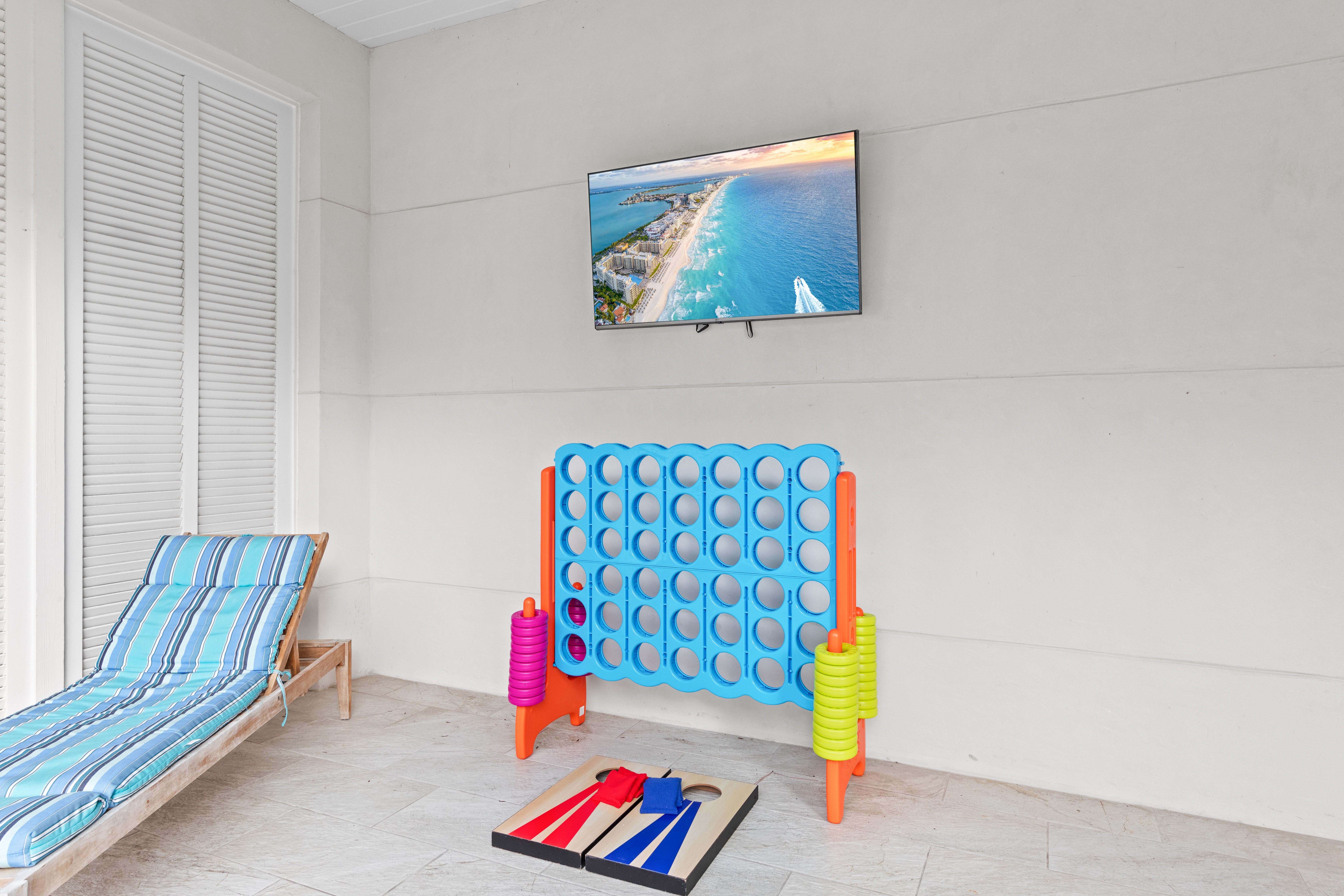 The first floor features a private guest suite with a queen bed, glass-enclosed tub/shower, dresser, and mounted TV, plus a convenient half bath. Step outside to the screened-in patio and outdoor living area with a dining table for six, covered lounge, gas grill, and a Mediterranean-inspired private saltwater plunge pool (seasonally heated on request). A pool safety alarm provides added peace of mind.
